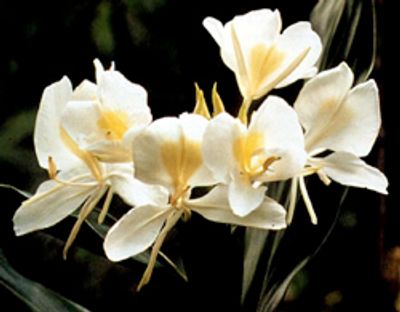 Ginger root is a tropical perennial herb that grows up to four feet tall with reed-like stems, narrow, spear-shaped leaves, and yellow flowers with purple markings.